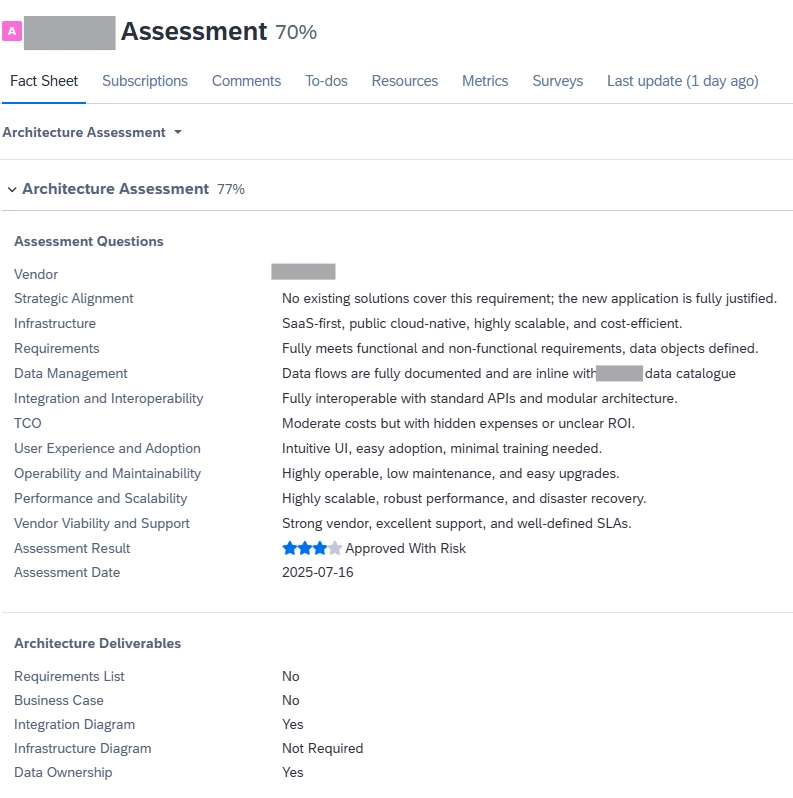 Hi Thomas ,hi Jim, happy to do so, if you tell me a smart way to extract all options at once without making 10 screenshots? ;) The questions are below with exemplary answers, obviously there’re 4 options to choose from in each of them (infosec explicitly excluded as we run a separate assessment there). ON top of that, how you see down below in the screenshot, we are checking for up to 5 material deliverables before project start. There are also optional comment fields next to each question. We have a simple calculation running to automatically fill the “Assessment Result” attribute.
