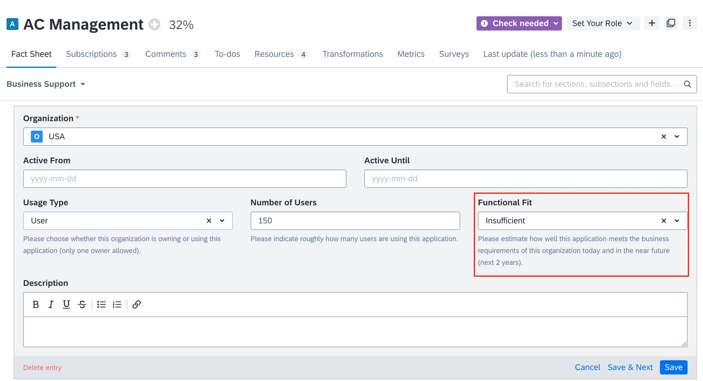 Is there a way to model this in LeanIX so that I can have different Functional Fit values per region, without creating duplicate Application fact sheets?