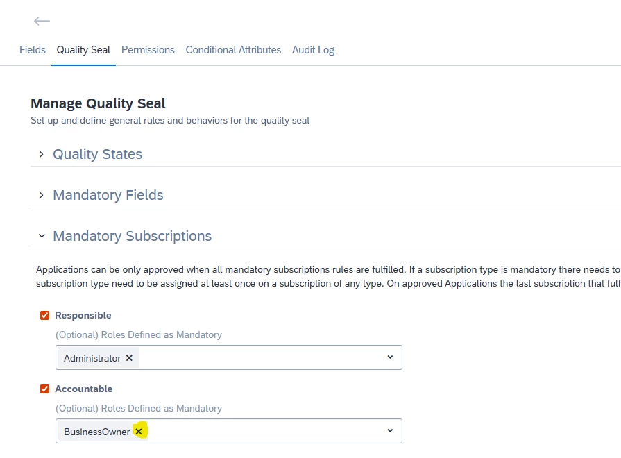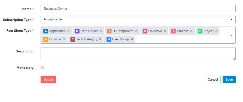 We have set up the Business Owner subscription to be required when creating a new application fact sheet but I want it to be optional and no longer required. Only the Application Owner should be required. When I go to change this, the "Mandatory" check box is greyed out and it says "This can only be changed in self-configuration". How do I change this so it's no longer required when creating a new fact sheet?