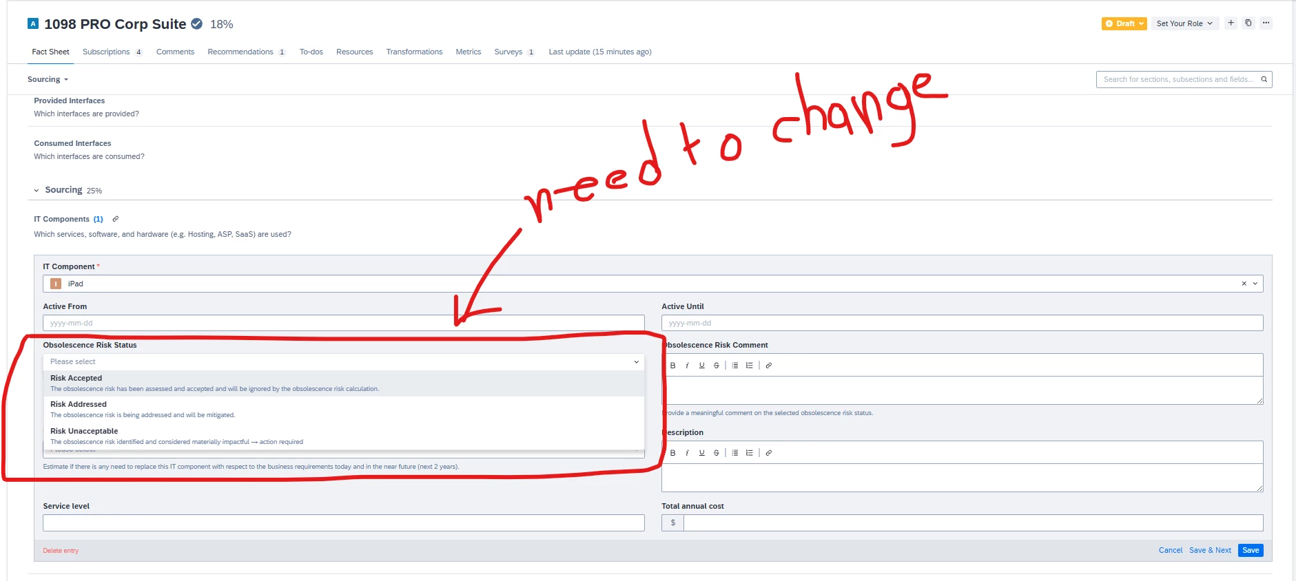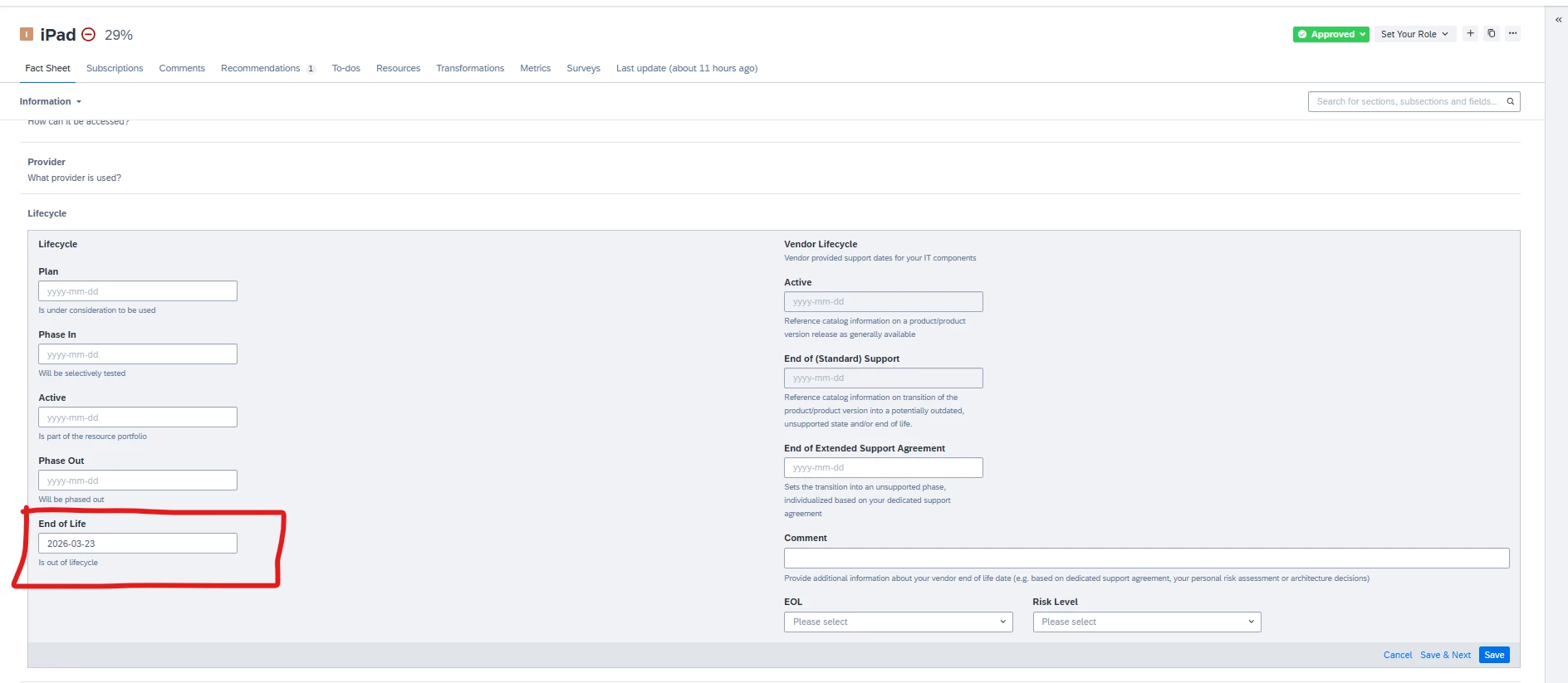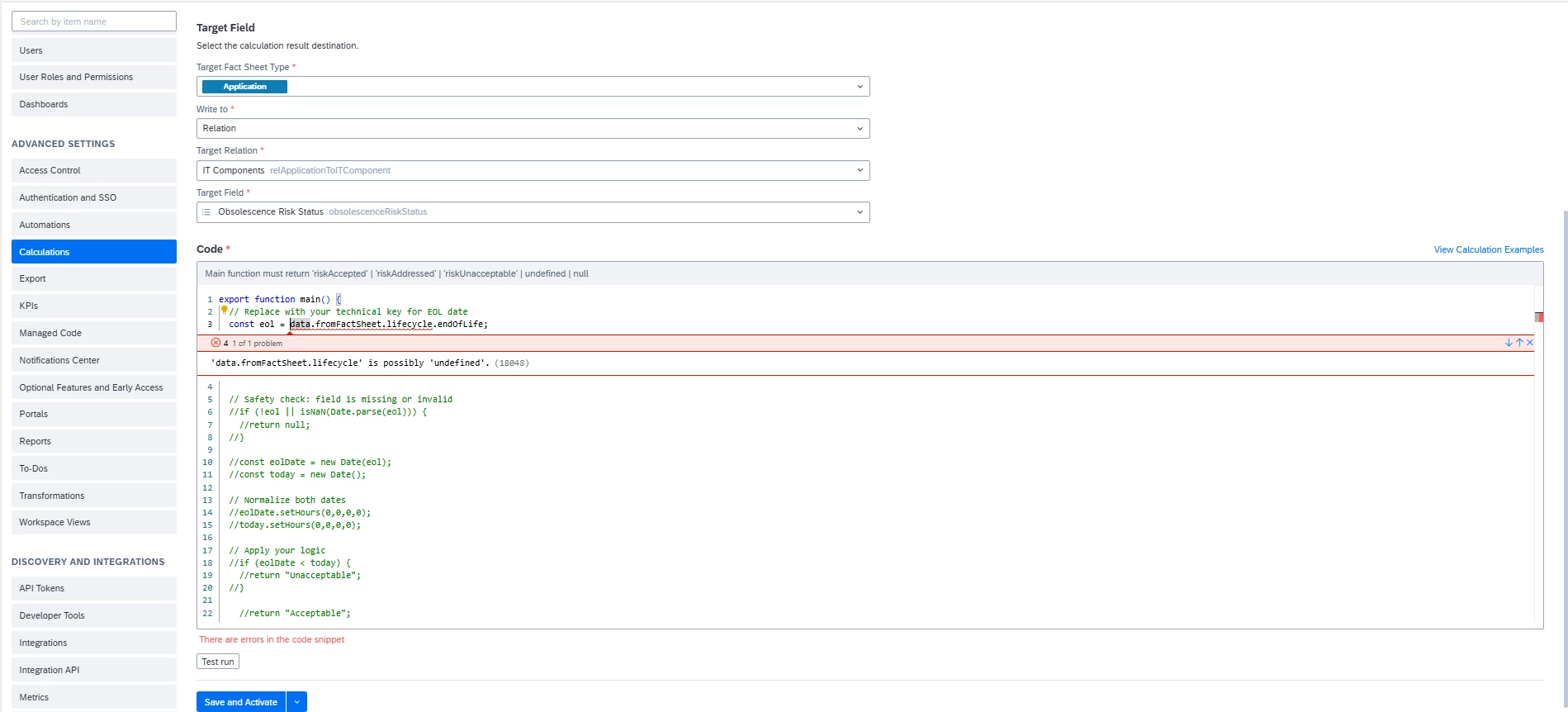 I’m trying to get EOL date in lifecycle, this is because I need to validate if the lifecycle date is still active or has already expired. In case it has ended, I need to change the risk status value to unacceptable, with a calculable field. The issue is that when I try to do that, it shows me this error. Could someone help me?