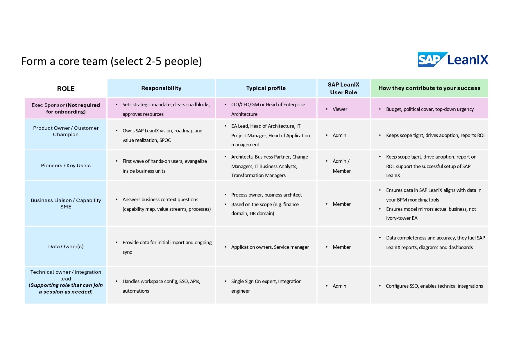 This cheat sheet summarizes all the key information about forming your LeanIX core team.