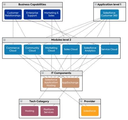- Take a common L1 application, like Salesforce, for example. We could relate BCs such as Marketing & Sales, Finance, etc. to Salesforce and that’d technically be true, but what information are we actually missing out on here? In the image below you’ll get an idea of what exactly we are talking about - being able to relate the Marketing & Sales BC to Marketing Cloud and Sales Cloud (L2 Applications) gives us a better idea of what specifically these Apps are doing for your business, as well as who is using them.