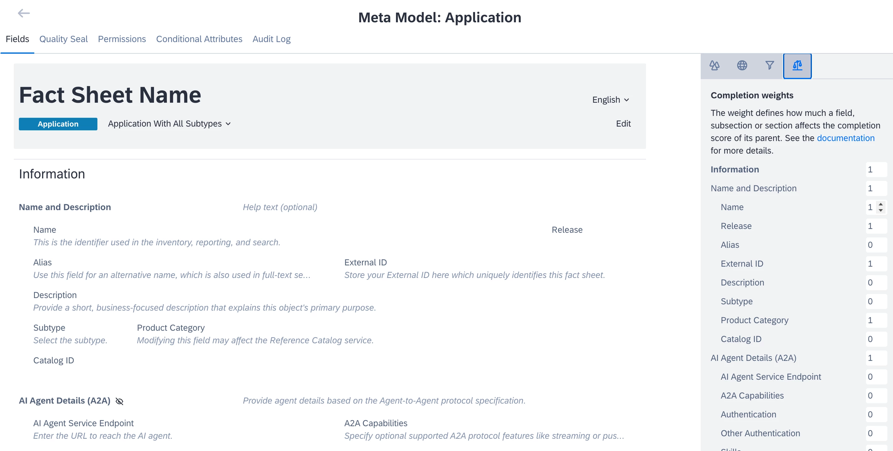 Each Fact Sheet includes attributes and relations contributing to a completion score. Administrators can weight critical fields more heavily. Attributes and relations count toward completeness; tags do not.