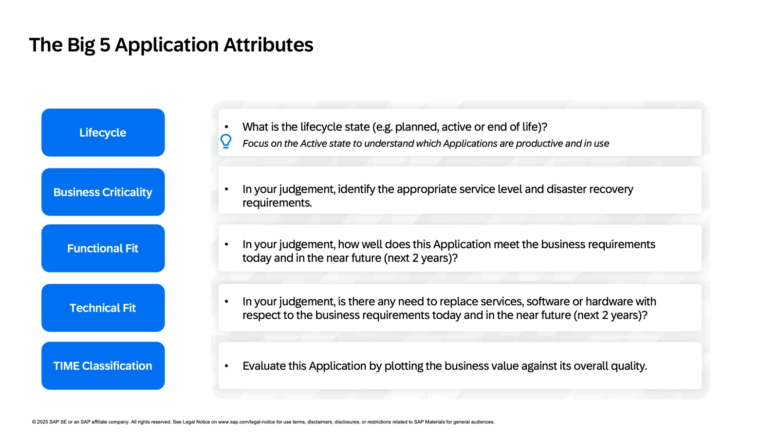 Important note: Some of the fields below (such as Business Criticality, Functional Fit, and Technical Fit) are judgement-based. To ensure consistency, many organizations collect this data through standardized surveys rather than manual input.