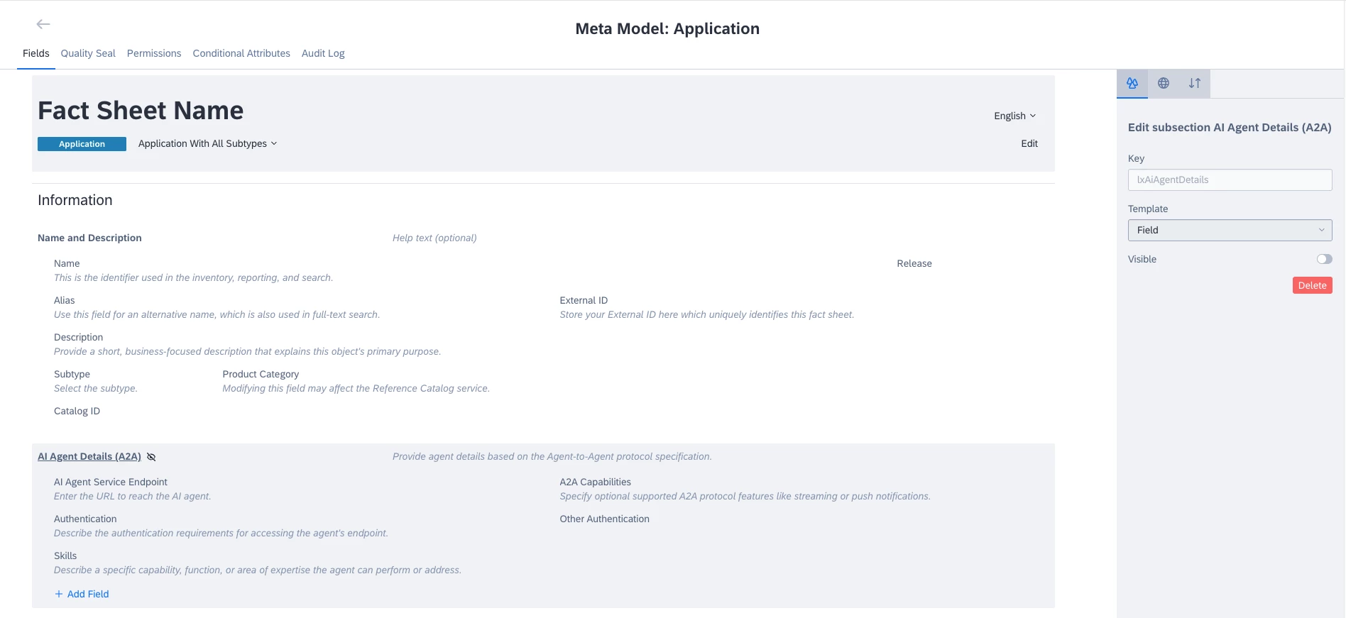 Just like for the section above, head to the Meta Model Configuration section in the administration area. Select the Fact Sheet type you want to modify, then click on a section or subsection and turn off the Visible toggle in the right-side panel. Finally, save your changes.