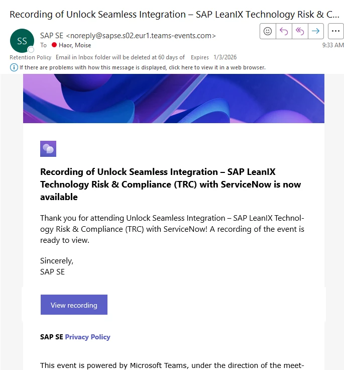 Join our first session in the three-part SAP LeanIX Technology Risk & Compliance (TRC) series to see how ServiceNow integration streamlines risk management, aligns architecture, and delivers real-time IT insights.
